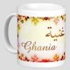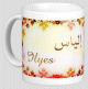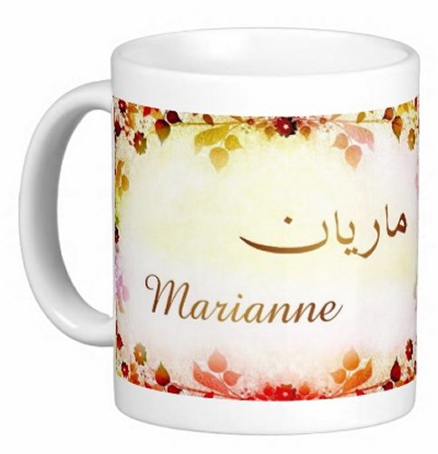 Mug avec le prénom "Marianne" écrit en français, en arabe (ماريان) et calligraphié de façon artistique en arabe sur la partie droite.