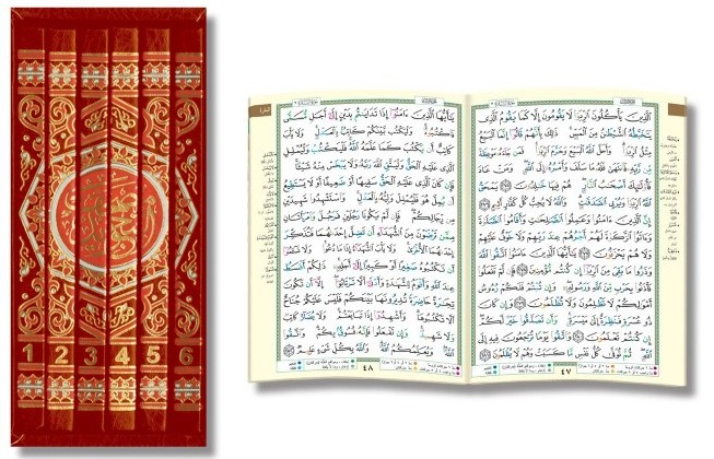 Ces six parties du Coran avec tajwid sont en format portrait standard, chaque partie étant magnifiquement et solidement reliée et numérotée (de 1 à 6) en couverture. Chaque page contient 15 lignes comme tout Coran standard, avec en marge une interprétation des mots sélectionnés.