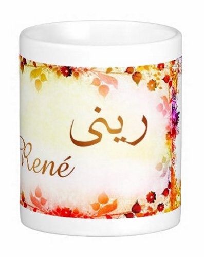Mug avec le prénom "René" écrit en français, en arabe (ريني) et calligraphié de façon artistique en arabe sur la partie droite.