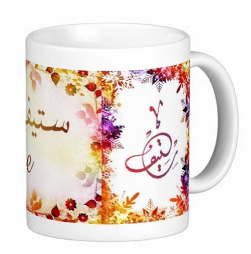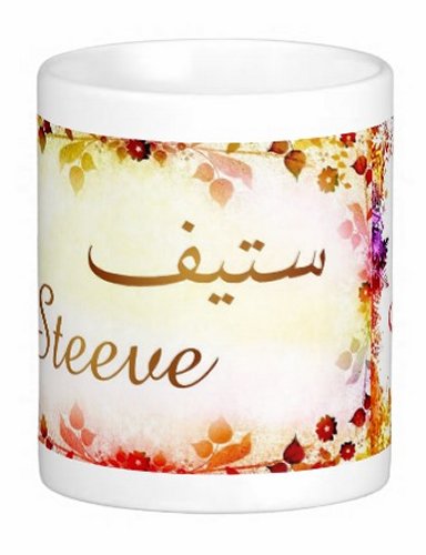 Mug avec le prénom "Steeve" écrit en français, en arabe (ستيف) et calligraphié de façon artistique en arabe sur la partie droite.