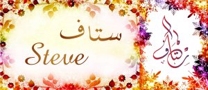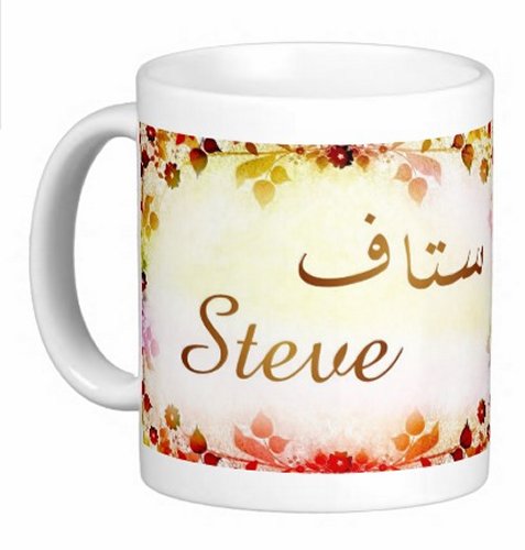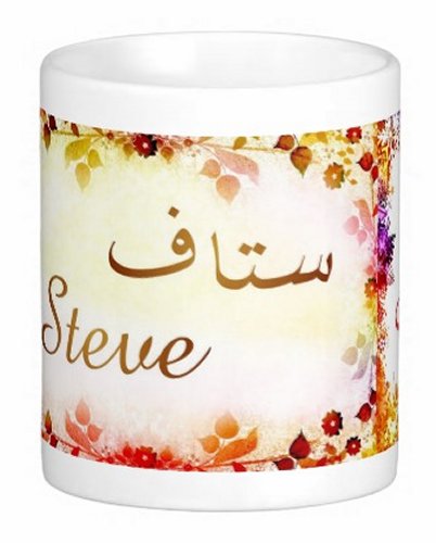 Mug avec le prénom "Steve" écrit en français, en arabe (ستاف) et calligraphié de façon artistique en arabe sur la partie droite.