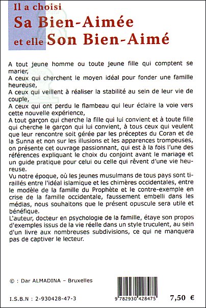 A tout garçon qui cherche la fille qui lui convient et à toute fille qui cherche le garçon qui lui convient, à tous ceux qui veulent que leur rencontre soit gérée par les préceptes du Coran et de la Sunna et non sur les illusions et les apparences trompeuses, on présente cet ouvrage passionnant, qui est à la fois l'une des références expliquant le choix du conjoint avant le mariage et un guide pratique pour celui ou celle qui rêvent d'une vie heureuse.