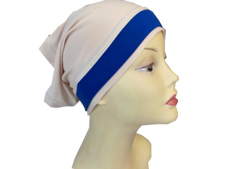 Bonnet beige extensible agrémenté d'une bande de tissu bleu à l'avant pour habiller vos hijabs avec style et modestie 24 cm.