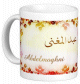 Mug avec le prénom "Aïmen" écrit en français, en arabe (أيمن) et calligraphié de façon artistique en arabe sur la partie droite.