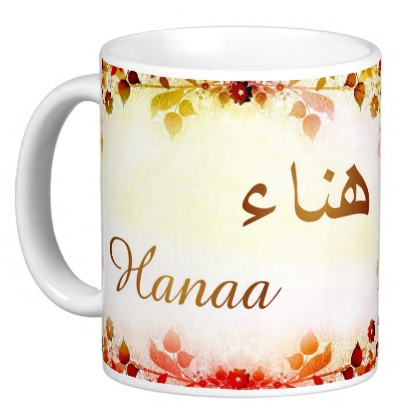 Mug avec le prénom "Hanaa" écrit en français, en arabe (هناء) et calligraphié de façon artistique en arabe sur la partie droite.
