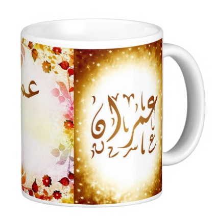 Mug avec le prénom "Imran" écrit en français, en arabe (عمران) et calligraphié de façon artistique en arabe sur la partie droite.