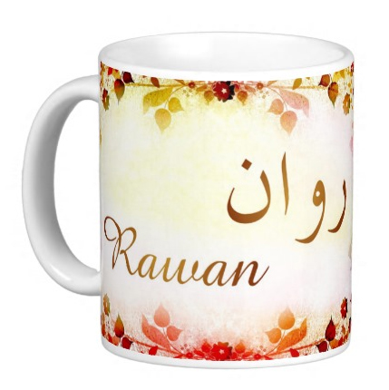 Mug avec le prénom "Rawan" écrit en français, en arabe (روان) et calligraphié de façon artistique en arabe sur la partie droite.