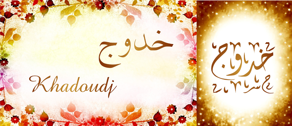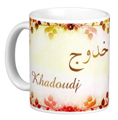 Mug avec le prénom "Khadoudj" écrit en français, en arabe (خدوج) et calligraphié de façon artistique en arabe sur la partie droite.