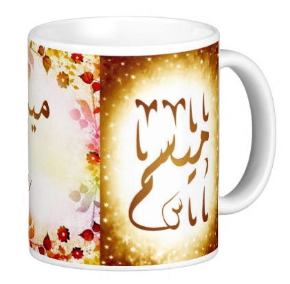 Mug avec le prénom "Maissam" écrit en français, en arabe (ميسم) et calligraphié de façon artistique en arabe sur la partie droite.