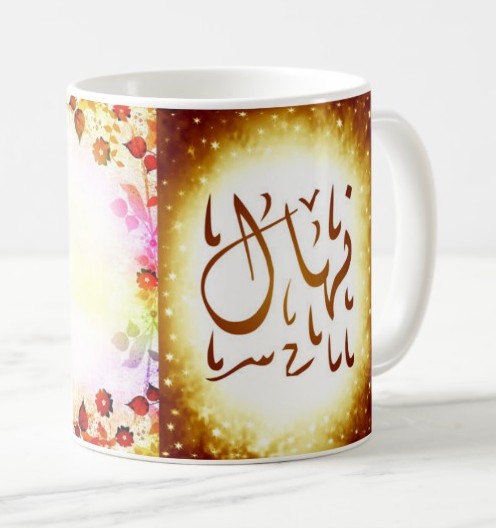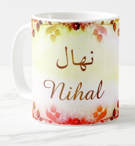 Mug avec le prénom "Nihal" écrit en français, en arabe (نهال) et calligraphié de façon artistique en arabe sur la partie droite.