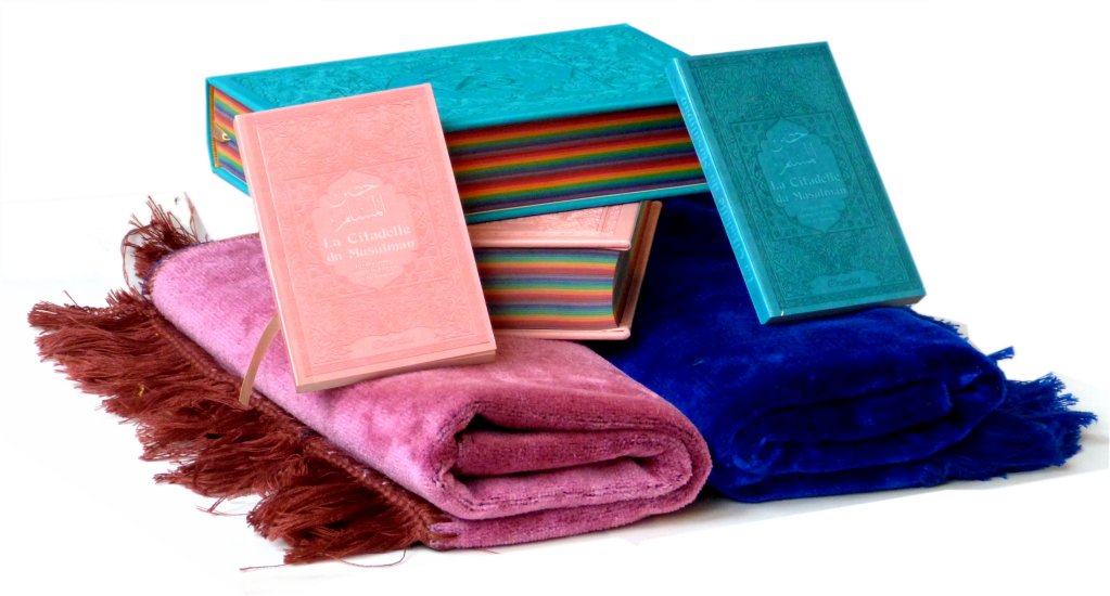 Pack cadeaux mariage : Le Saint Coran avec couleurs Arc-en-ciel, La Citadelle du Musulman et Tapis assorties (Bleu/Rose)