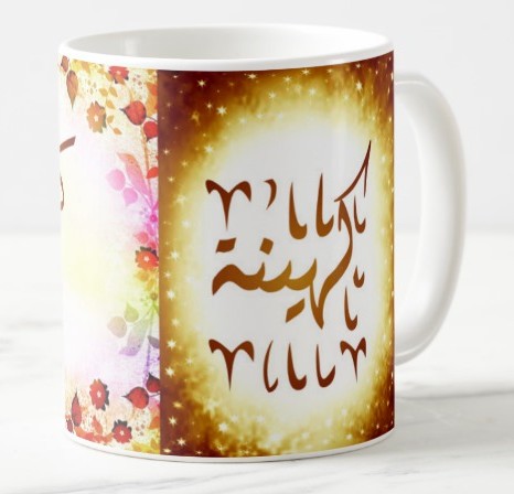 Mug avec le prénom "Kahina" écrit en français, en arabe (كهينة) et calligraphié de façon artistique en arabe sur la partie droite.