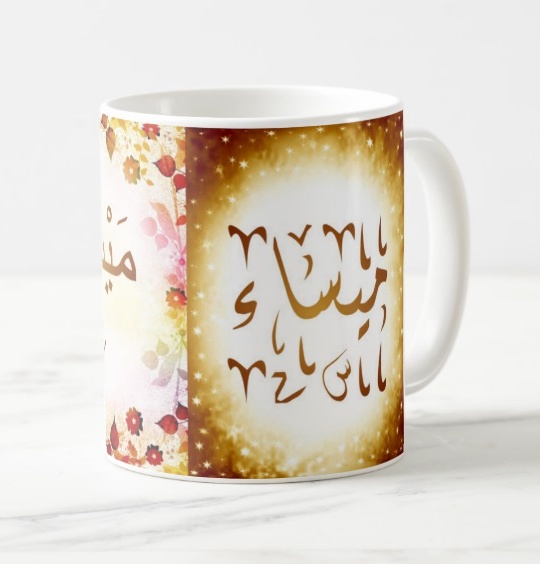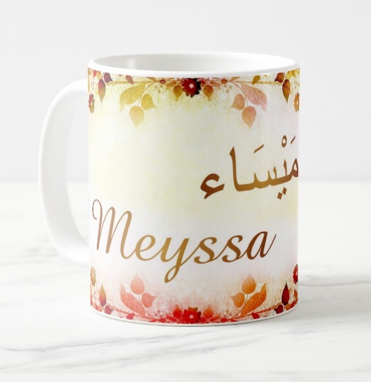 Mug avec le prénom "Meyssa" écrit en français, en arabe (ميساء) et calligraphié de façon artistique en arabe sur la partie droite.
