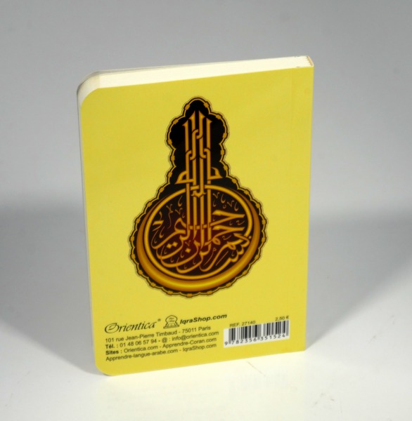 Couverture jaune décorée d'arabesques et de calligraphies avec bords arrondis. Contient Jouz' 'Ammâ complet (Deux Hizb : 'Amma et Sabih...)
