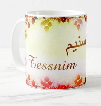 Mug avec le prénom "Tessnim" écrit en français, en arabe (تسنيم) et calligraphié de façon artistique en arabe sur la partie droite.
