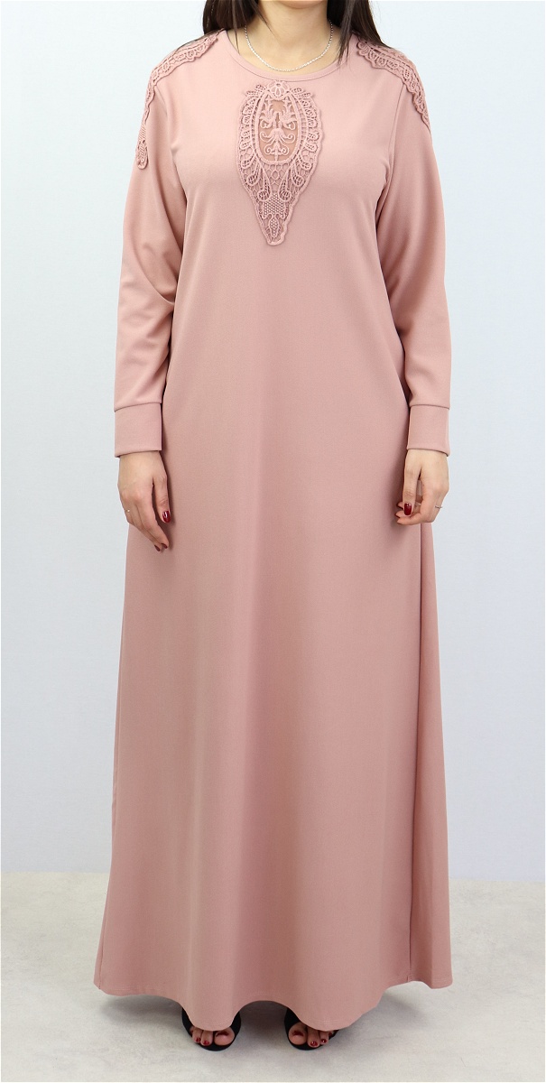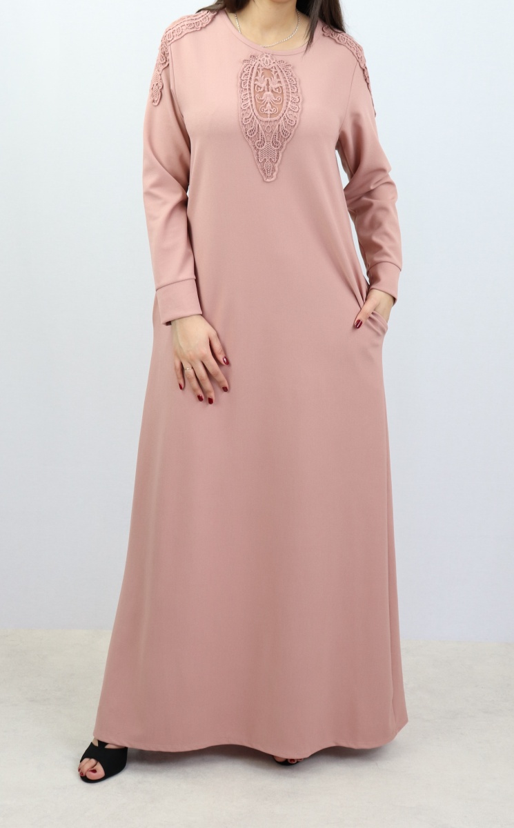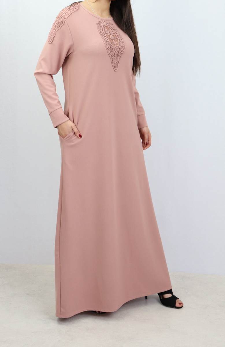 Robe très longue évasée de couleur rose pale avec poches et broderies sur l'avant et les épaules. Tissu fluide, élastique et épais (non transparent).