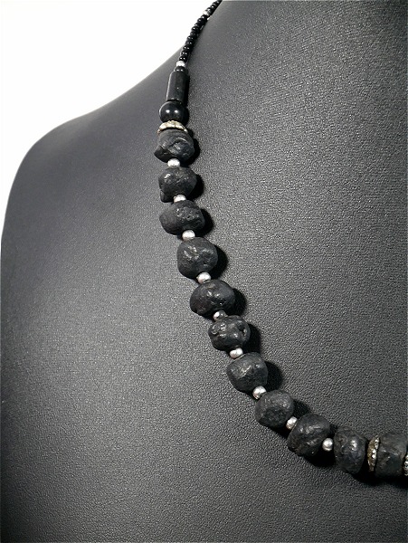 Collier ethnique artisanal 21 pierres noires de 1cm agrémenté de fines perles argentées Vetement & Accessoire