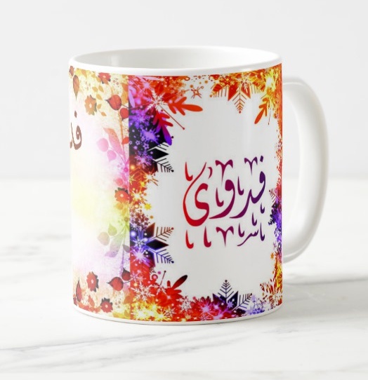 Mug avec le prénom Fadoua calligraphié en arabe ainsi que son écriture normale en arabe (فدوى) et en français.