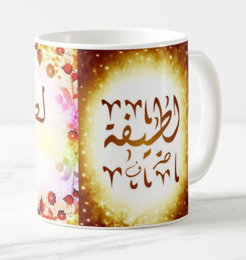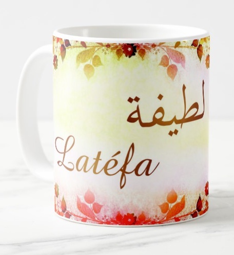 Mug avec le prénom Latéfa calligraphié en arabe ainsi que son écriture normale en arabe (لطيفة) et en français.
