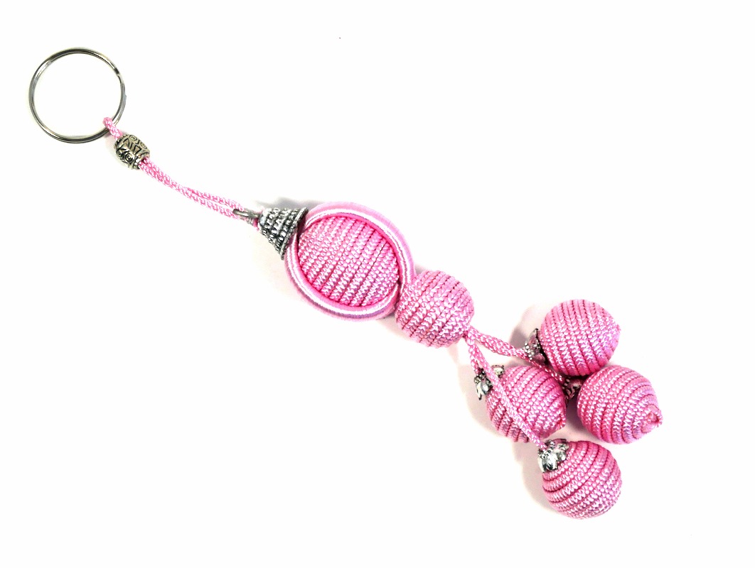 Portes-clés totalement fabriqué à la main par un artisan qui a soigné sa finition en introduisant des pompons et en choisissant un beau rose clair qui saura vous plaire.