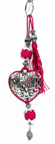 Porte-clés artisanal coeur en métal argenté ciselé et pompon en sabra - Rouge - REF. 29101 (6.90 €)