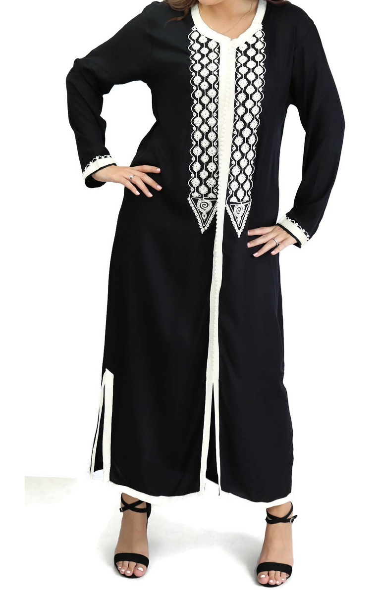 Robe Marocaine / Gandoura à manches longues avec broderie blanche - Couleur Noir Vetement & Accessoire