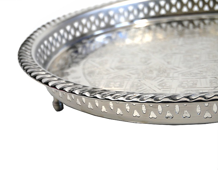 Plateau rond artisanal marocain en métal argenté cerclé et délicatement ciselé avec pieds (35 cm) - REF. 29818 (22.00 €)