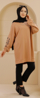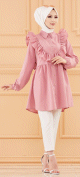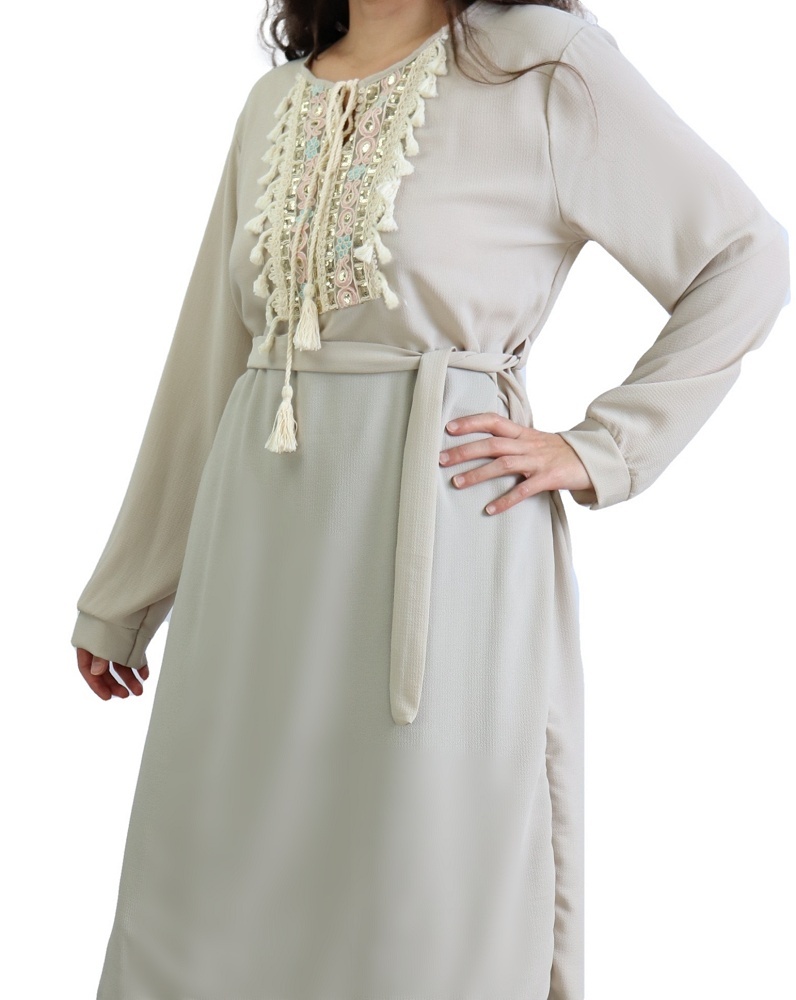 Tunique à pompons brodée, col rond doté de cordons, avec sa ceinture assortie, matière légère et agréable à porter .