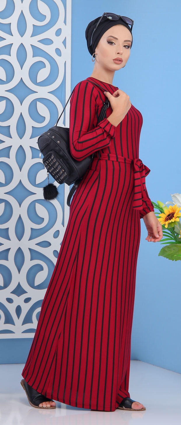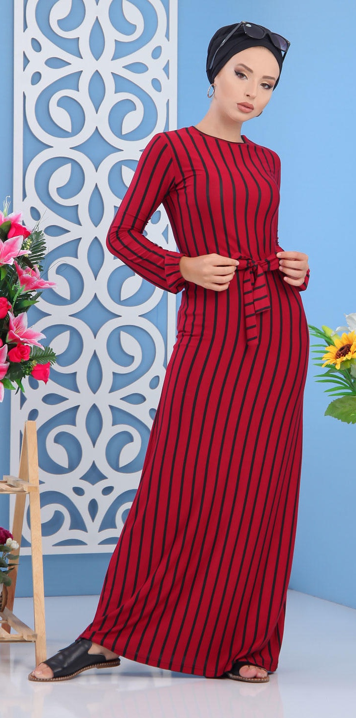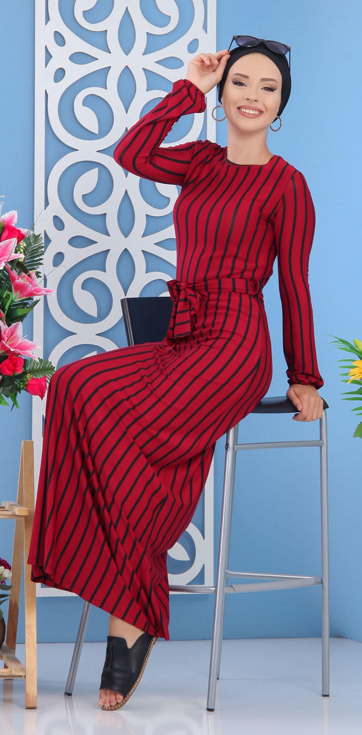 Robe à rayures, col rond, manches longues finition élastiques aux poignets le tout assorti d'une ceinture. Ce modèle sobre et élégant peut se mettre dans multiples occasions.