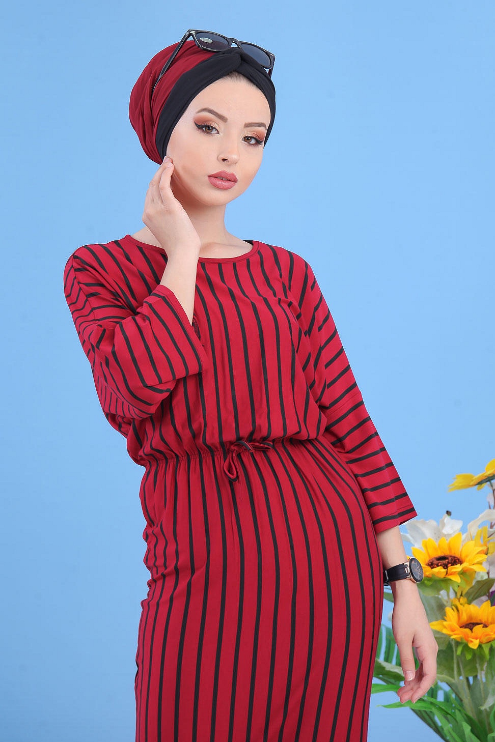 Robe à rayures, col rond, manches effet papillon, taille cintrée par un élastique, le tout orné d'un lien décoratif. Ce modèle sobre et élégant peut se mettre dans multiples occasions.