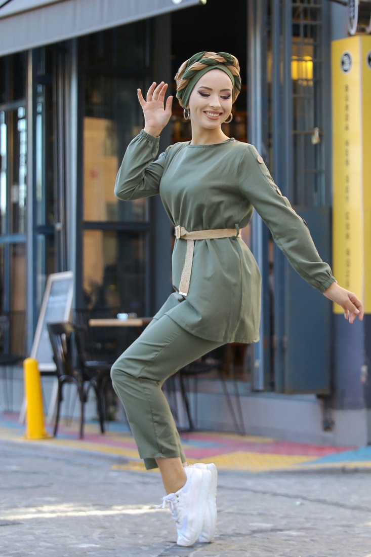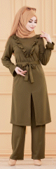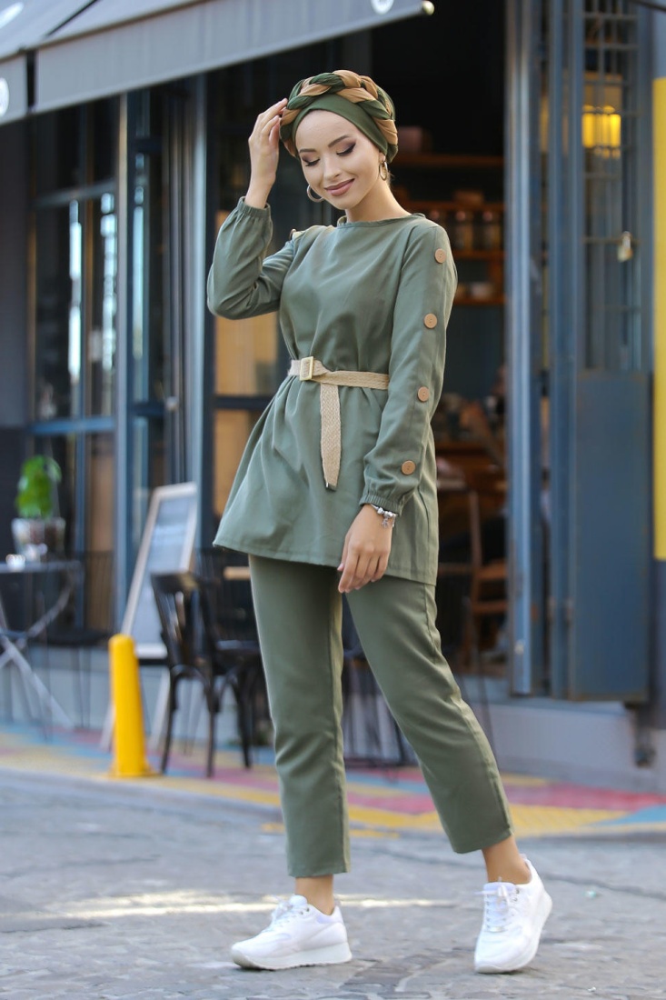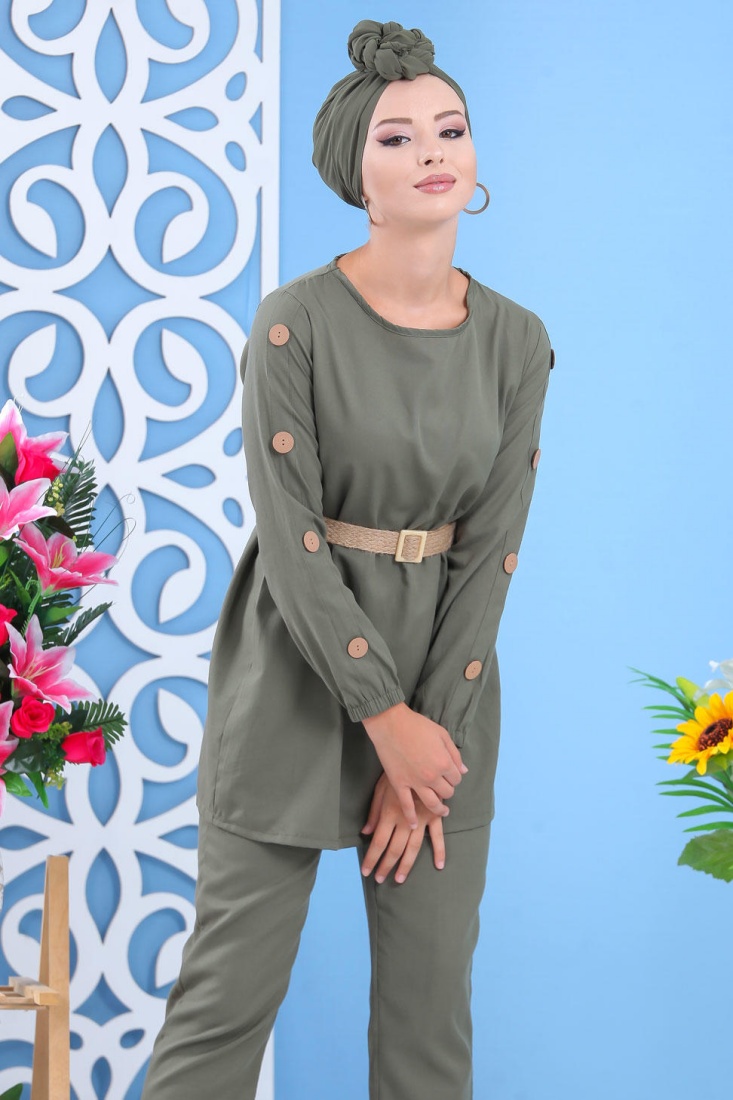 Ensemble tunique, col arrondi, ceinture tissée à passants, manches longues, décoration boutons, finition élastiques aux poignets, assorti de son pantalon taille élastique, coupe droite. Ce modèle est une valeur sûre de confort qui vous assurera un look chic au quotidien.