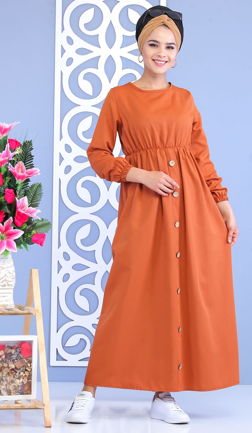 Robe longue, col arrondi, manches finition élastiques aux poignets, taille cintrée par un élastique, décoration boutons sur la partie du bas. Cette robe basique vous donnera une belle allure dans votre quotidien.