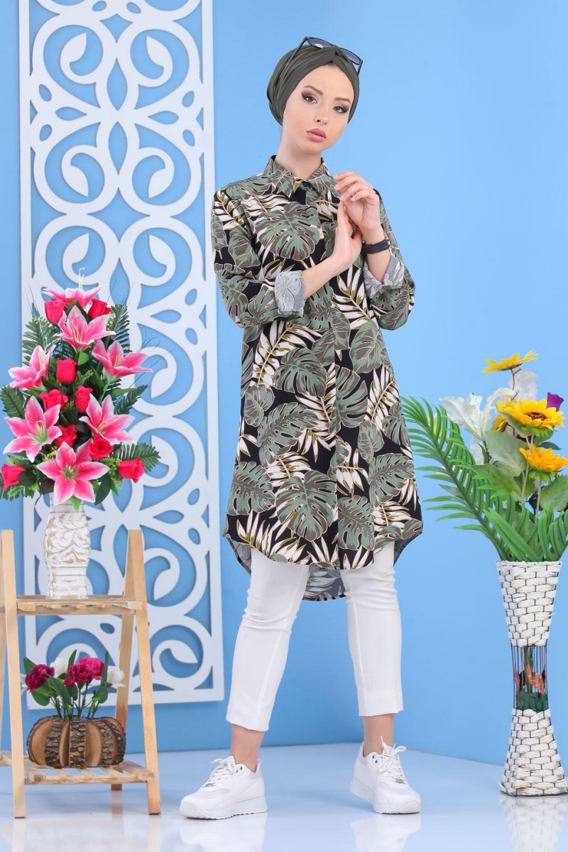 Chemise longue, col chemise, manches finition boutons aux poignets, coupe légèrement évasée, extrémités arrondies. Ce modèle à imprimés "tropical", très tendance, vous permettra de sortir du commun. Vous pourrez le porter aussi bien en journée qu'en soirée.