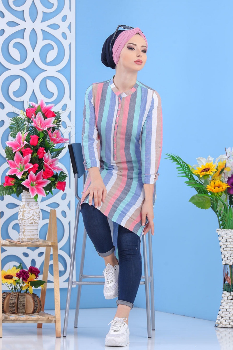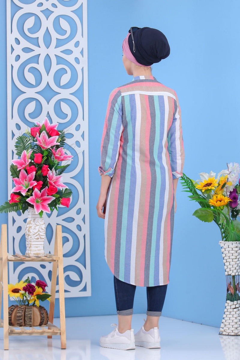 Tunique longue, col Mao fermeture pression, manches longues retroussables grâce à des pattes boutonnées, coupe droite plus longue et arrondie à l'arrière. Ce modèle au tissu léger s’accommodera avec beaucoup de vos vêtements, en l'achetant vous aurez l’embarras du choix pour porter cette belle tunique.