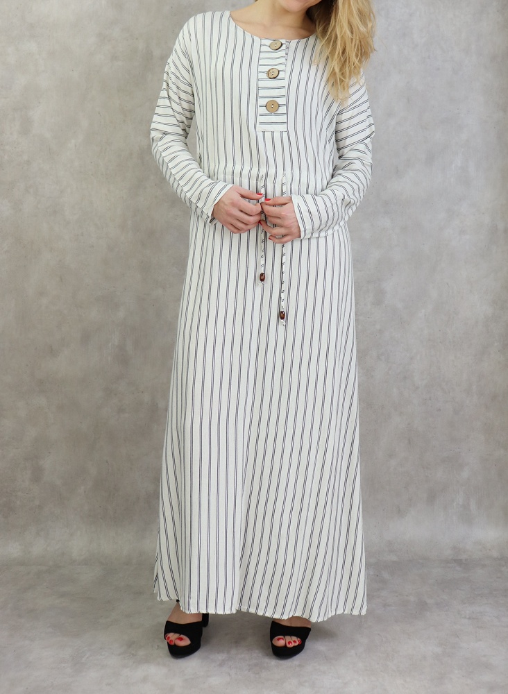 Robe longue, coupe droite, encolure arrondie, manches longues, fermeture boutons sur le buste. Découpe avec lien de serrage à la taille. Non doublée, tissu confortable.