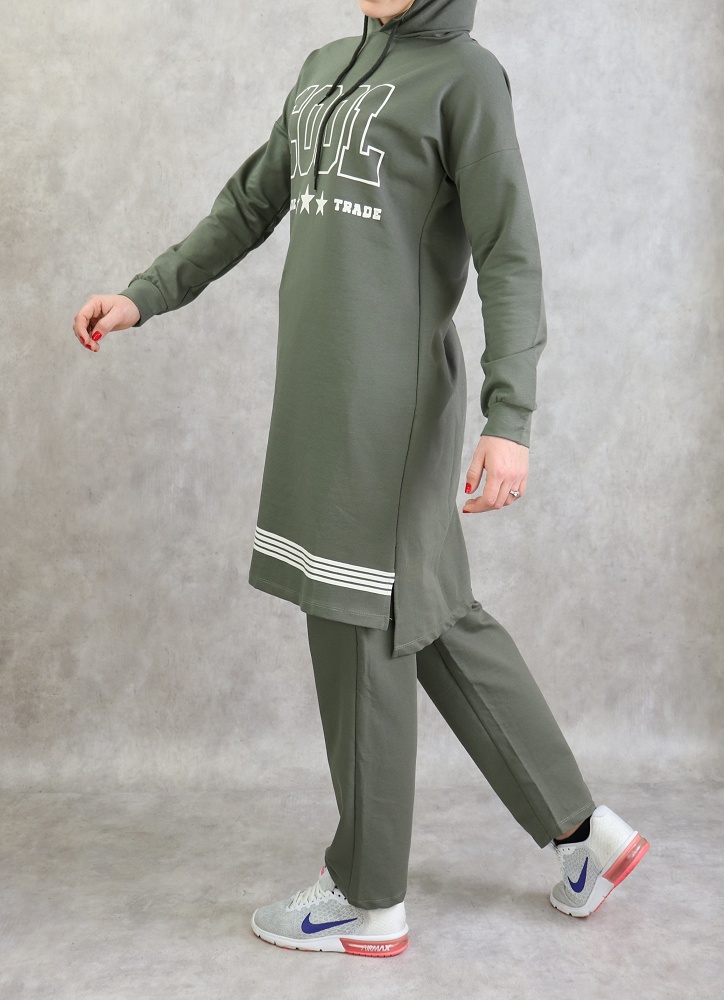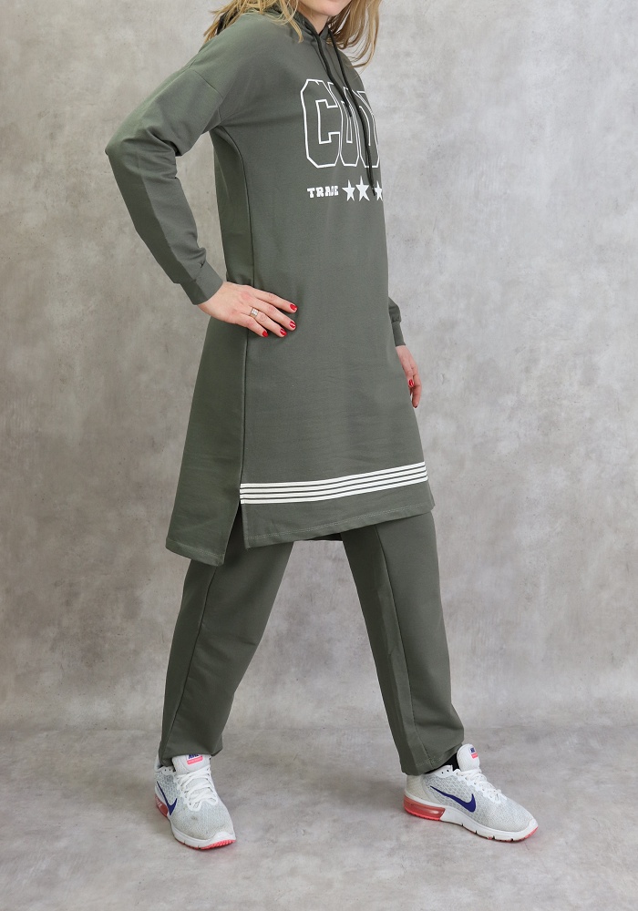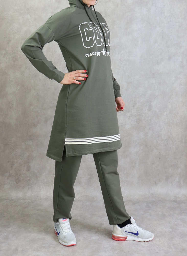Ensemble décontracté avec tunique à capuche ample et pantalon assorti (Vetement hijab de sport mastour pour femme voilée) - Couleur kaki - REF. 36268 (35.00 €)