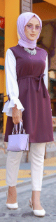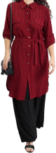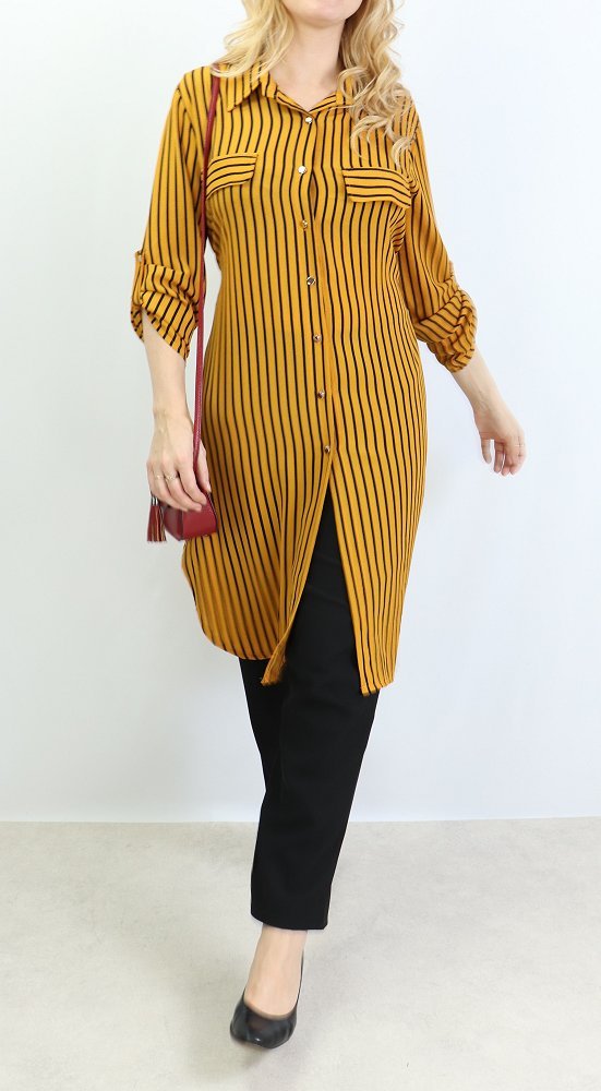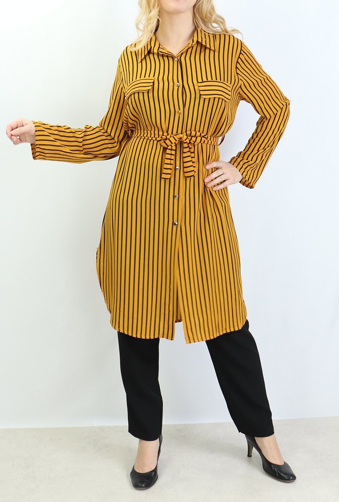 Chemise longue, manches ajustables, fermeture boutons, deux fausses poches plaquées, ceinture assortie, tissu effet crêpe, coupe droite.