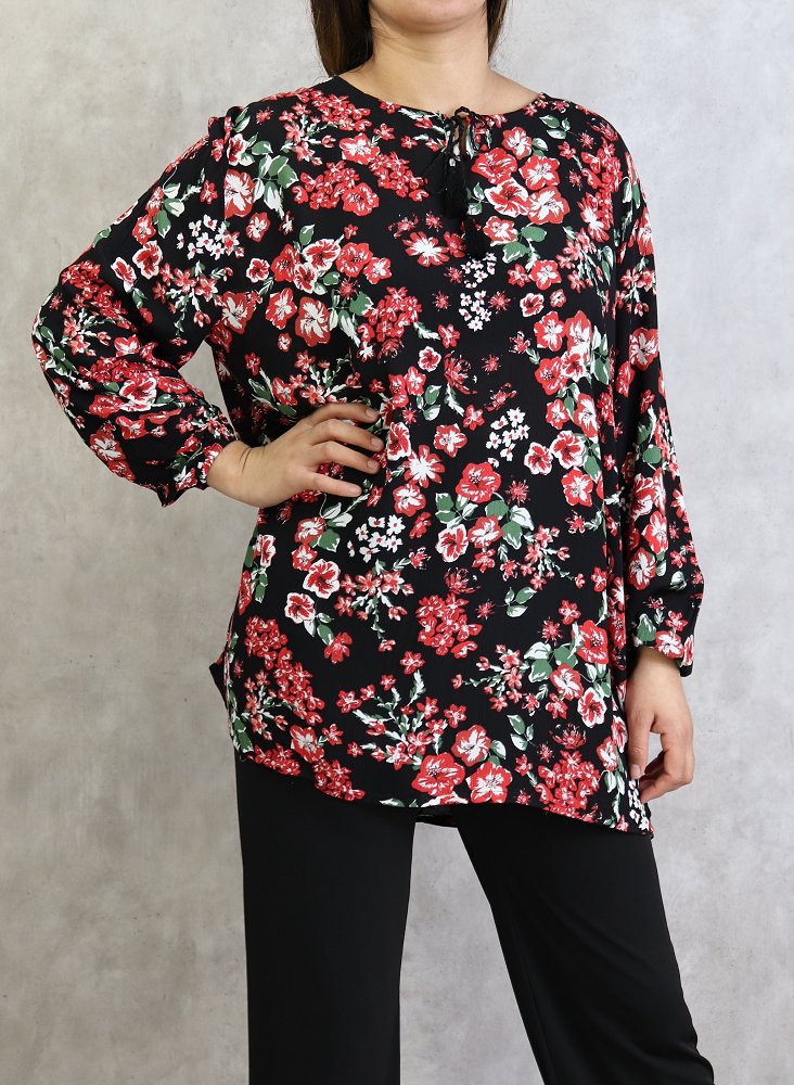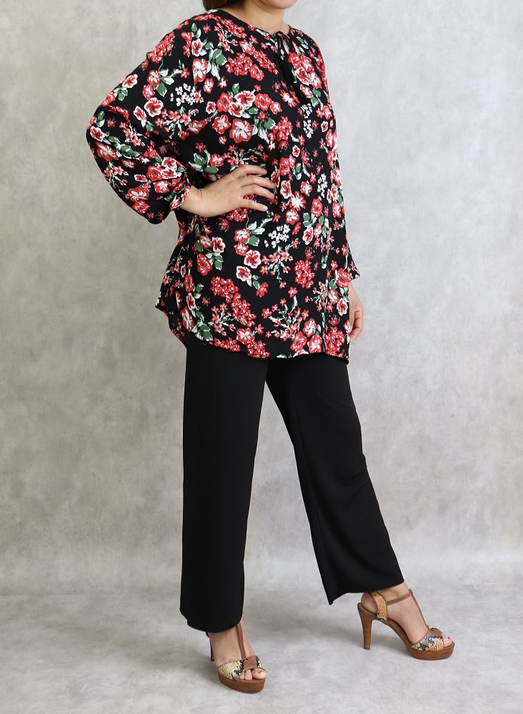Tunique courte, col dégagé, lien de serrage, manches longues finition élastiques aux poignets. Coupe droite, tissu fluide et léger.