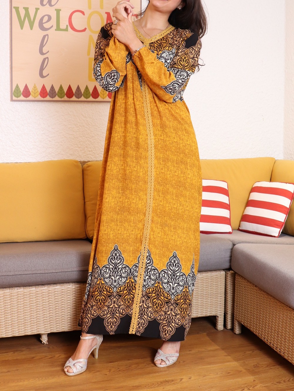 Longue robe imprimée avec motifs d'été, mangues longue élastique au poignet, col en V avec dentelles sur toute la longueur à l'avant, non transparente. Coupe droite. On aime son côté fluide et agréable à porter.