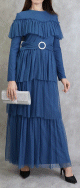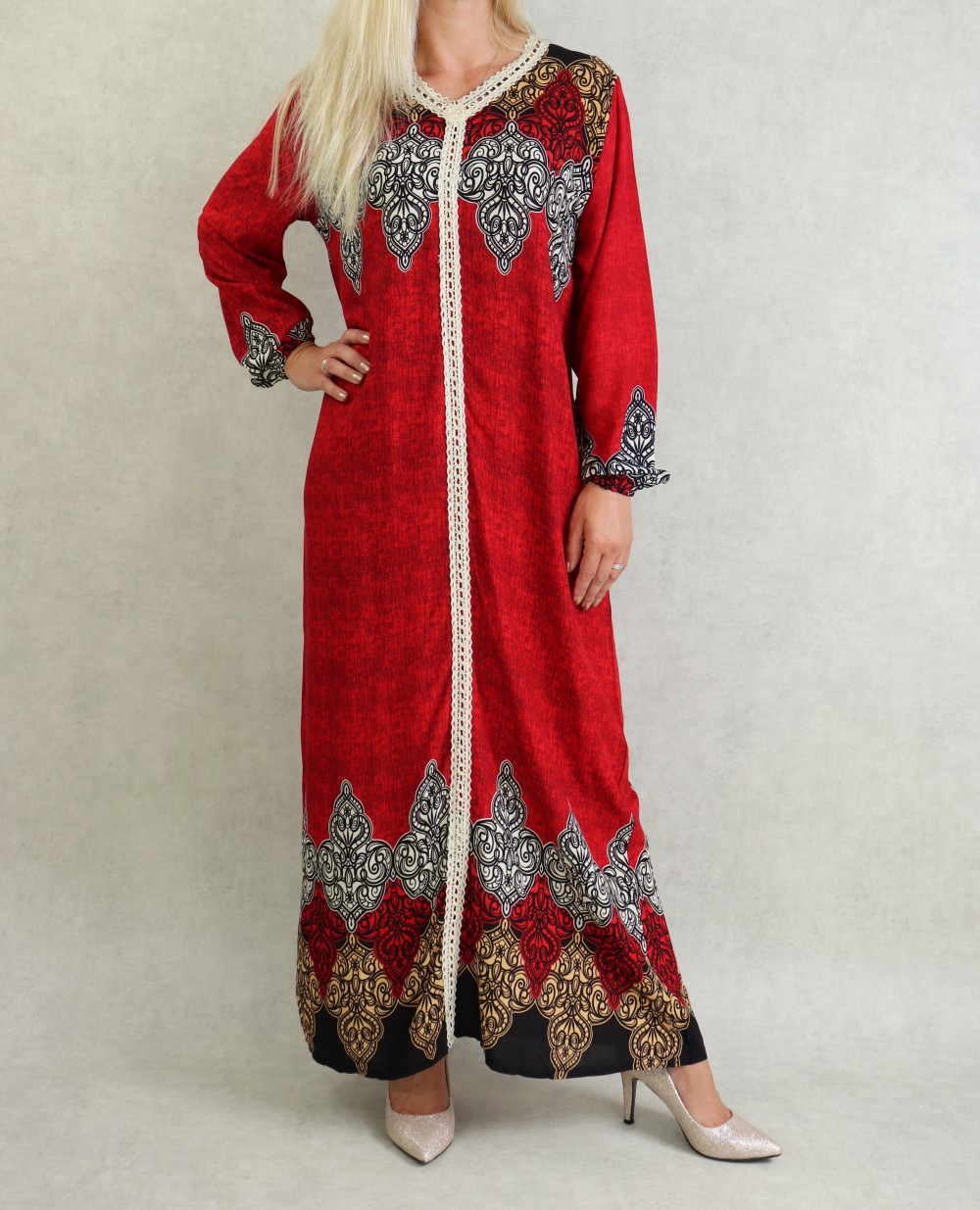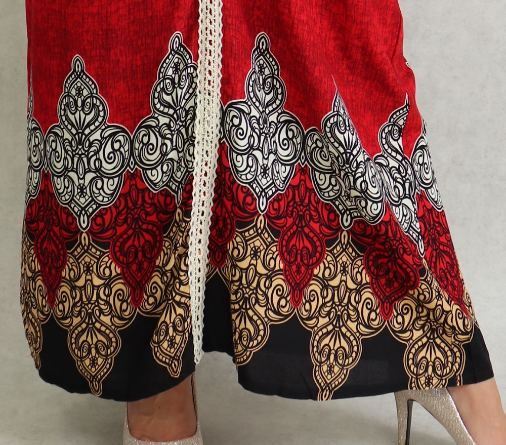 Longue robe imprimée avec motifs d'été, mangues longue élastique au poignet, col en V avec dentelles sur toute la longueur à l'avant, non transparente. Coupe droite. On aime son côté fluide et agréable à porter.