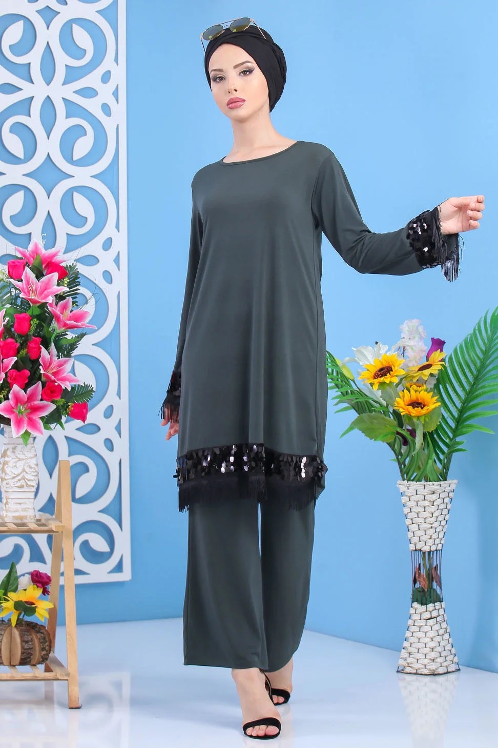 Ensemble 2 pièces de soirée. Tunique : coupe ample, col rond, franges et strass sur les poignets et le bas. Pantalon : taille élastique, coupe ample.
