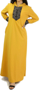 Robe longue moderne type abaya du Maroc avec capuche et motifs dorés pour femme - Couleur jaune moutarde - REF. 29684 (29.00 €)