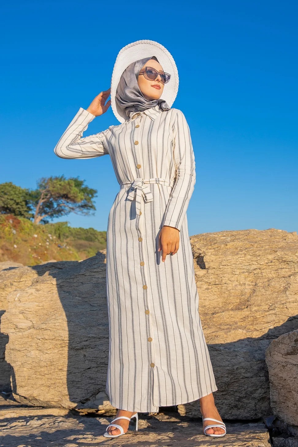 Robe chemise très longue à rayures (Hijab femme voilée chic) - Couleur Crème et gris Vetement & Accessoire