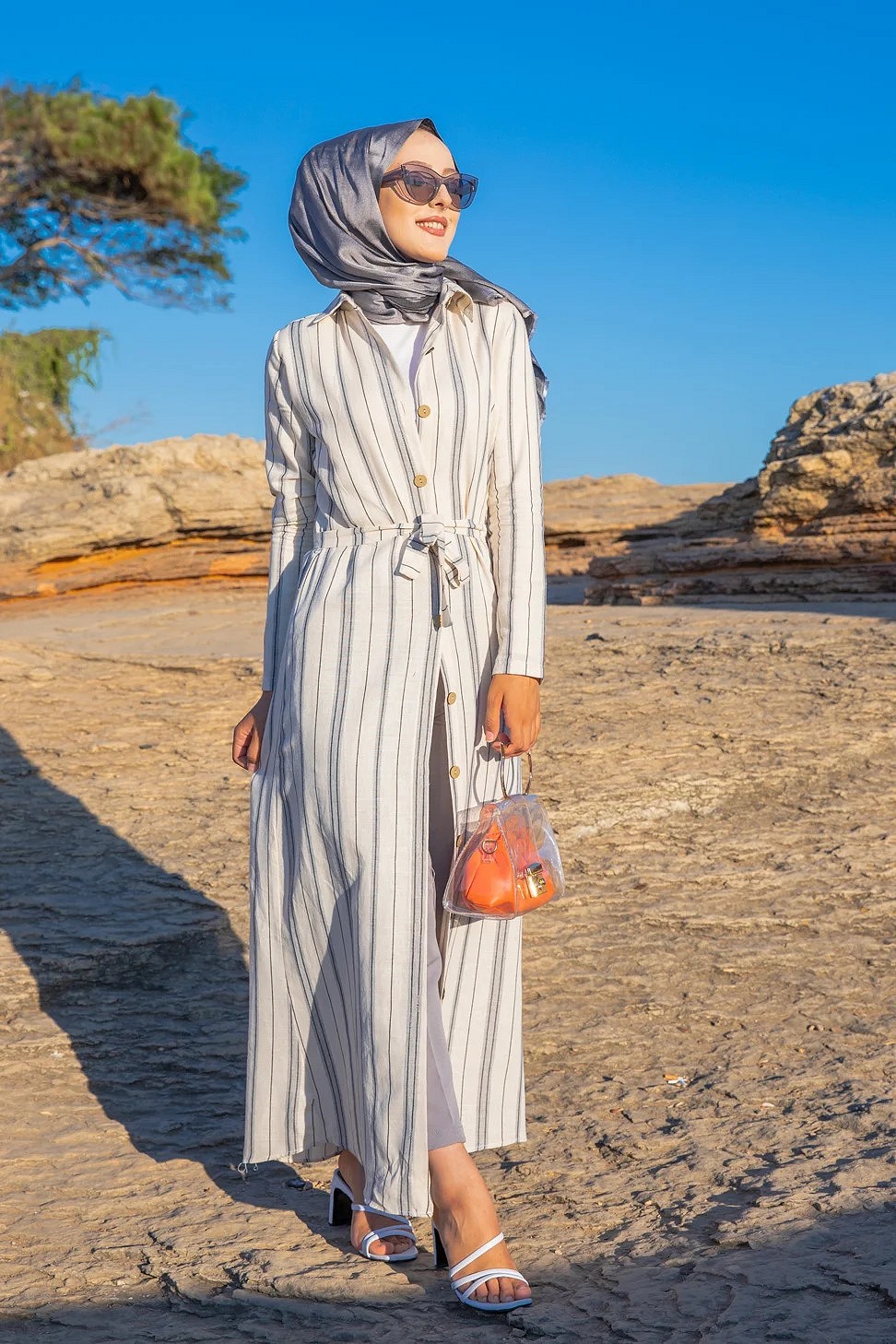 Robe chemise tres longue a rayures (Hijab femme voilee chic) - Couleur Creme et gris