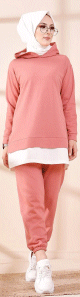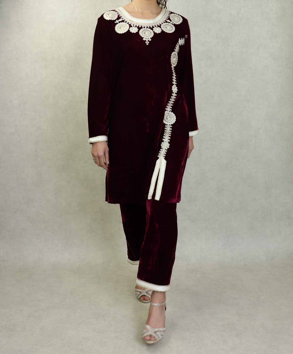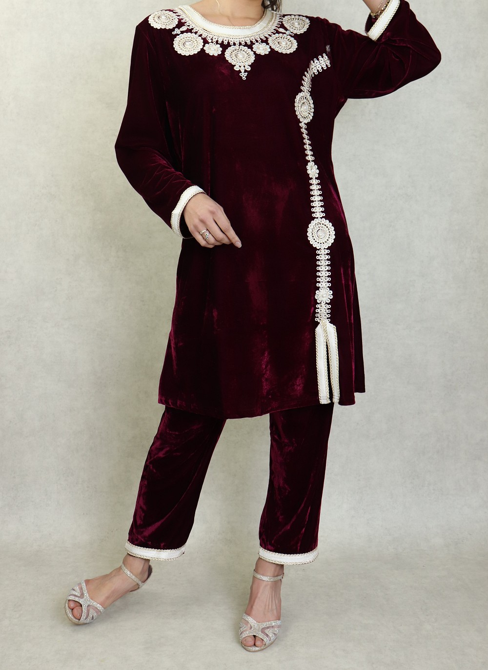 Ensemble style Jabador femme effet velours composé d’une tunique avec broderie et strasse sur l'encolure et toute la longueur de la tunique. Pantalon assorti avec ceinture élastique, deux poches latérales, coupe droite.