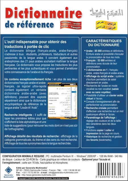 Un contenu exceptionnellement riche : en plus de ses deux dictionnaires français-arabe et arabe-français, ce logiciel ultra-rapide contient également un véritable dictionnaire arabe-arabe (avec définitions) pouvant être exploité séparément ainsi que le dictionnaire encyclopédique de référence de la langue arabe “Lissân Al ‘Arab”.