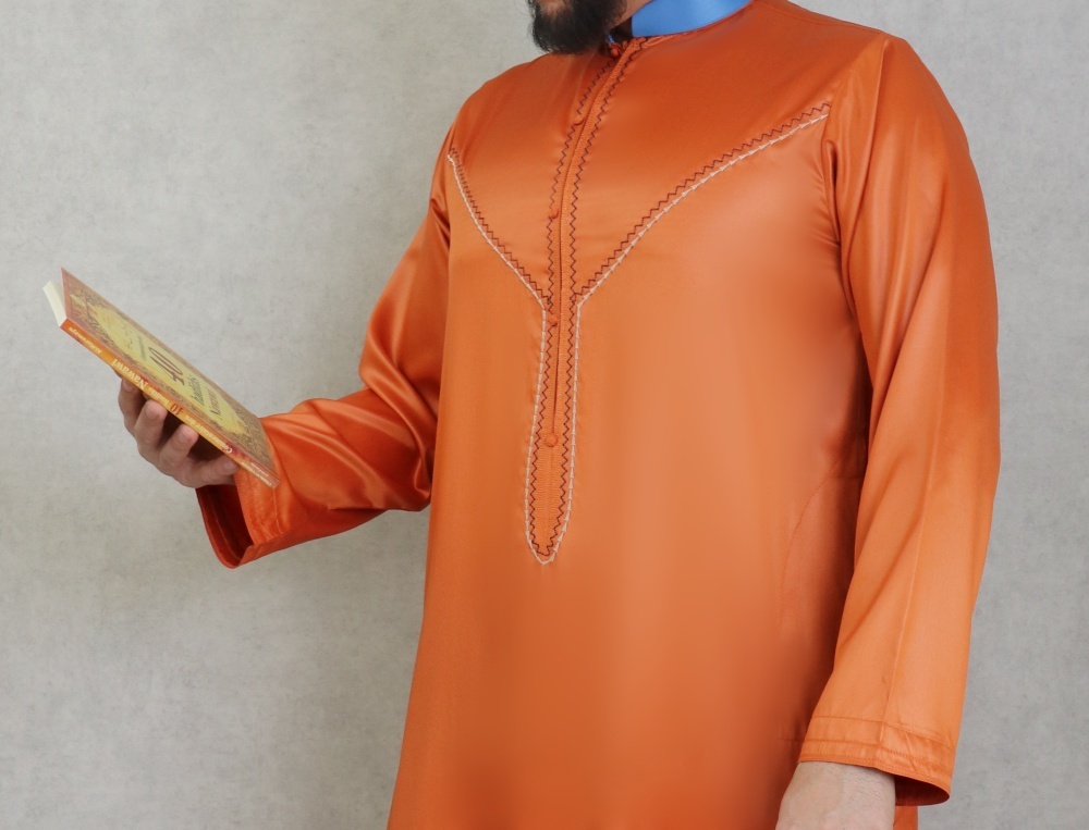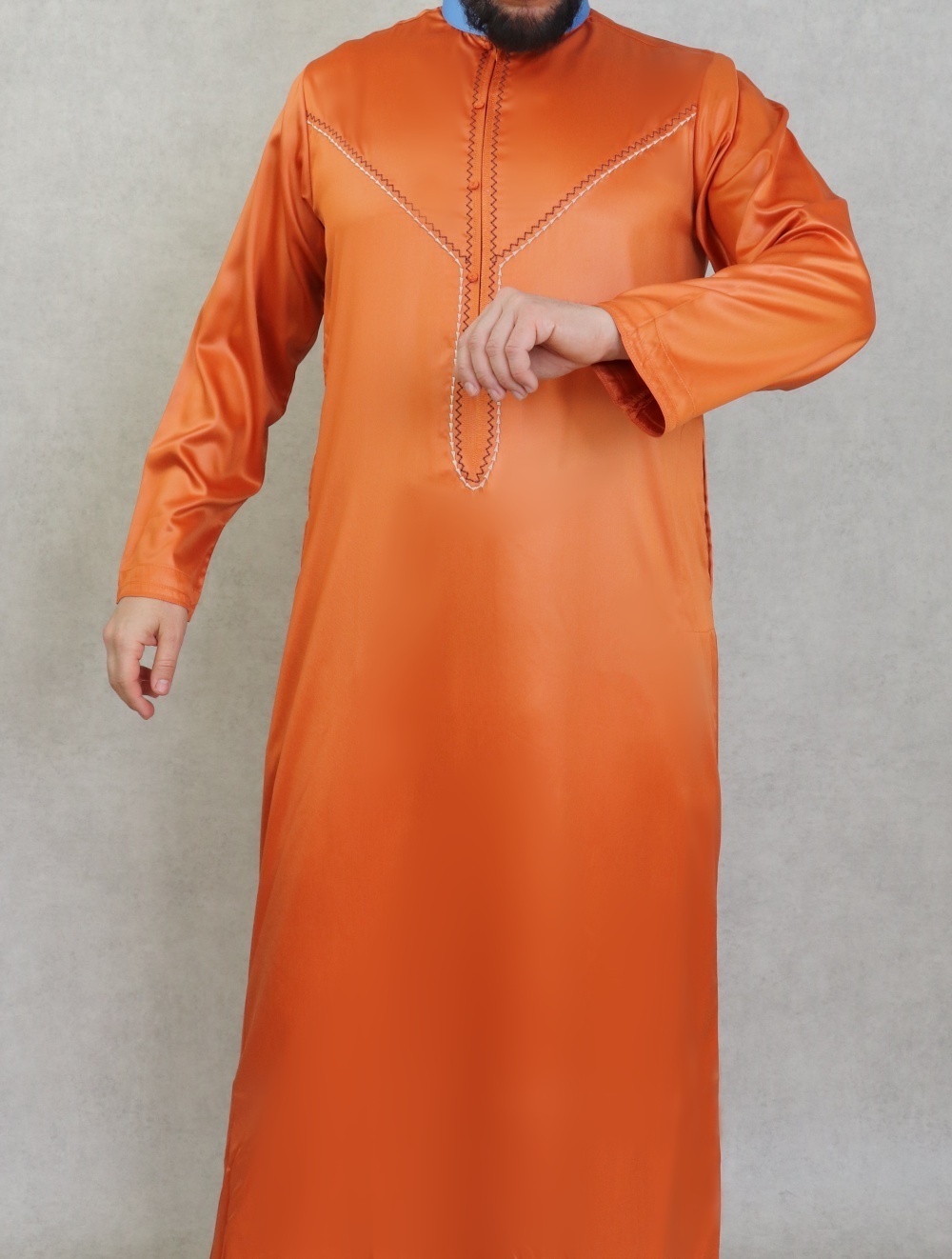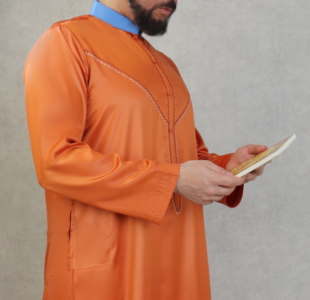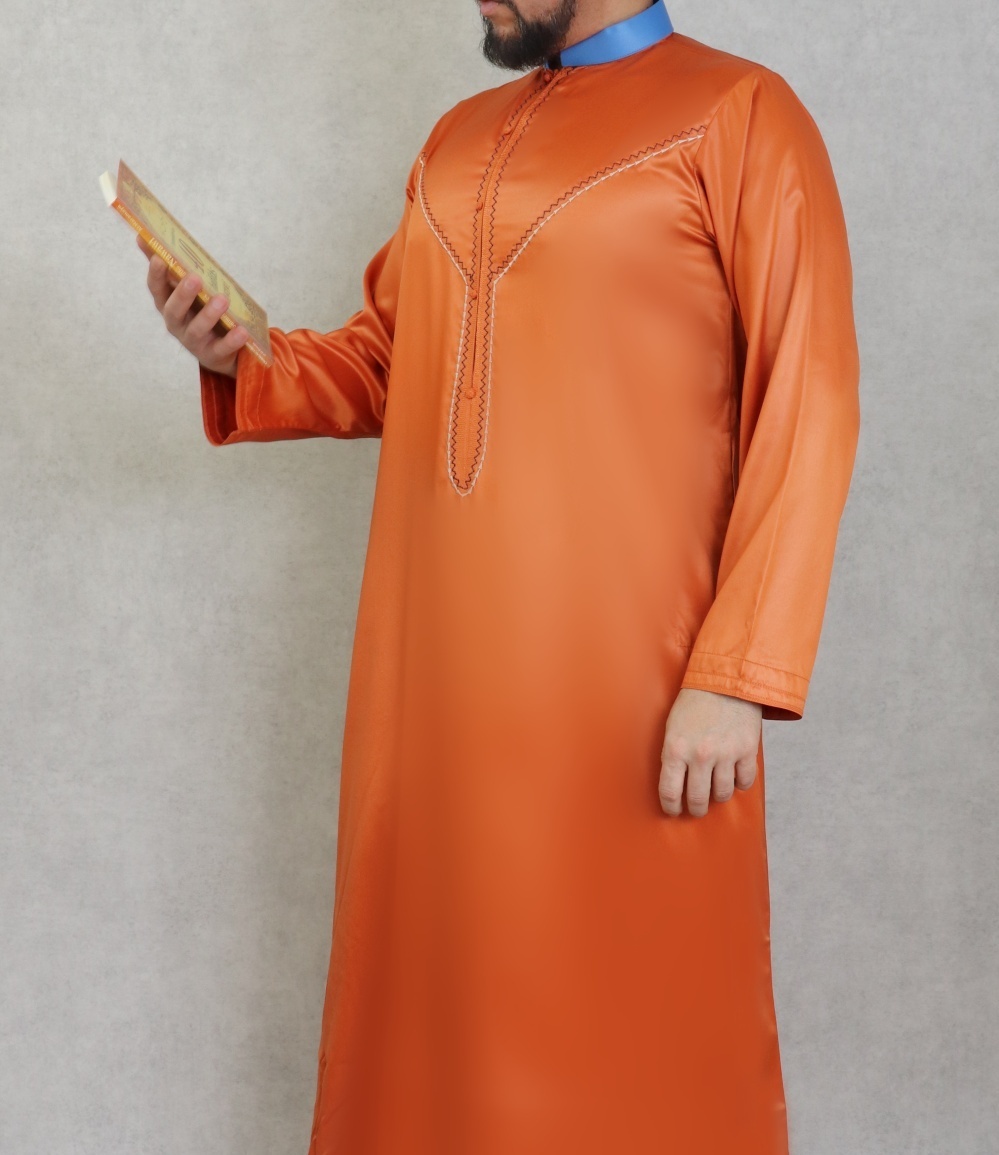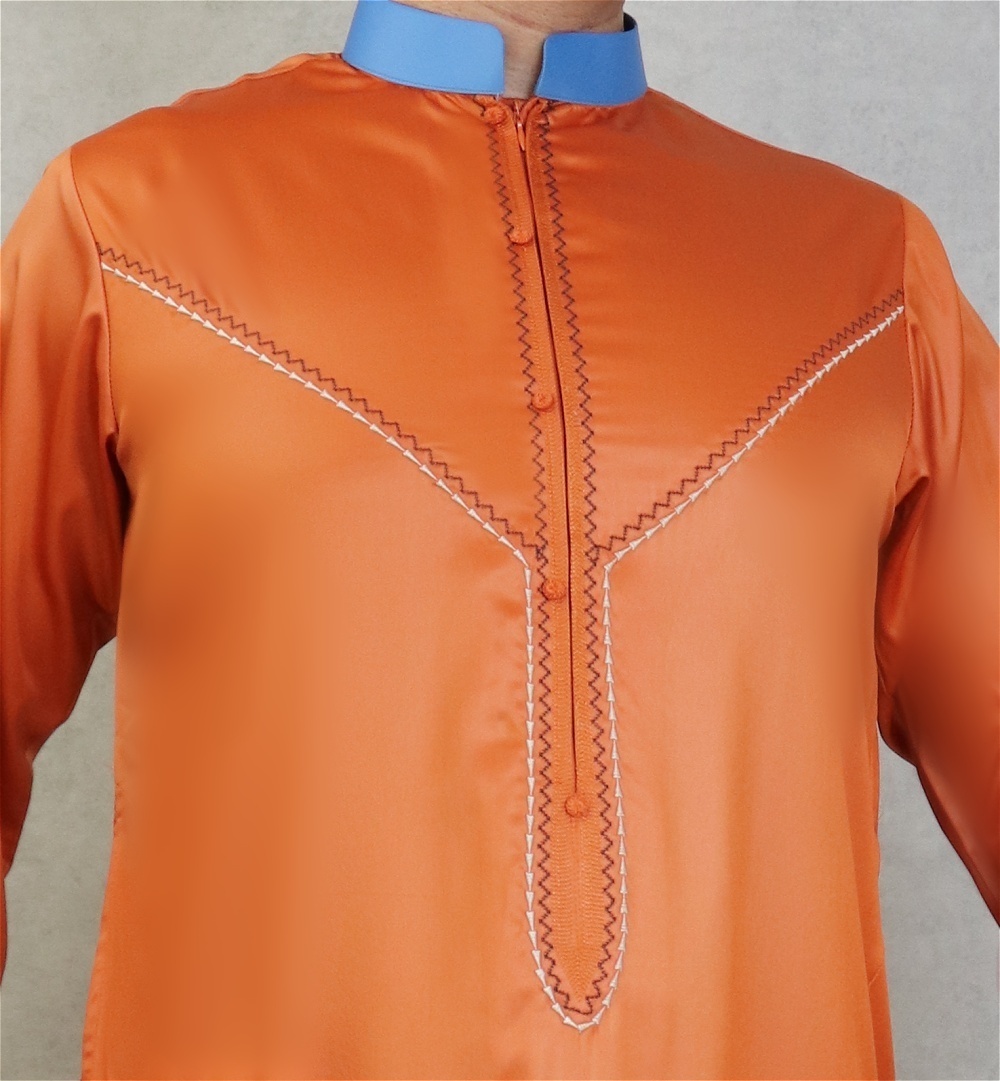 Qamis long, manches longues, ouverture zip cachée au niveau de la poitrine. Décoration sous forme de faux boutons. Col de couleur bleu. Tissu fluide et très agréable de qualité supérieure, légèrement satiné, toutes saisons.