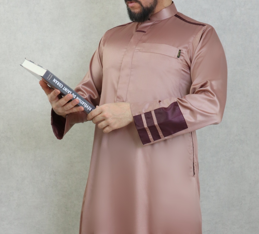 Qamis moderne de luxe tissu satiné pour homme - Couleur beige foncé et aubergine Vetement & Accessoire