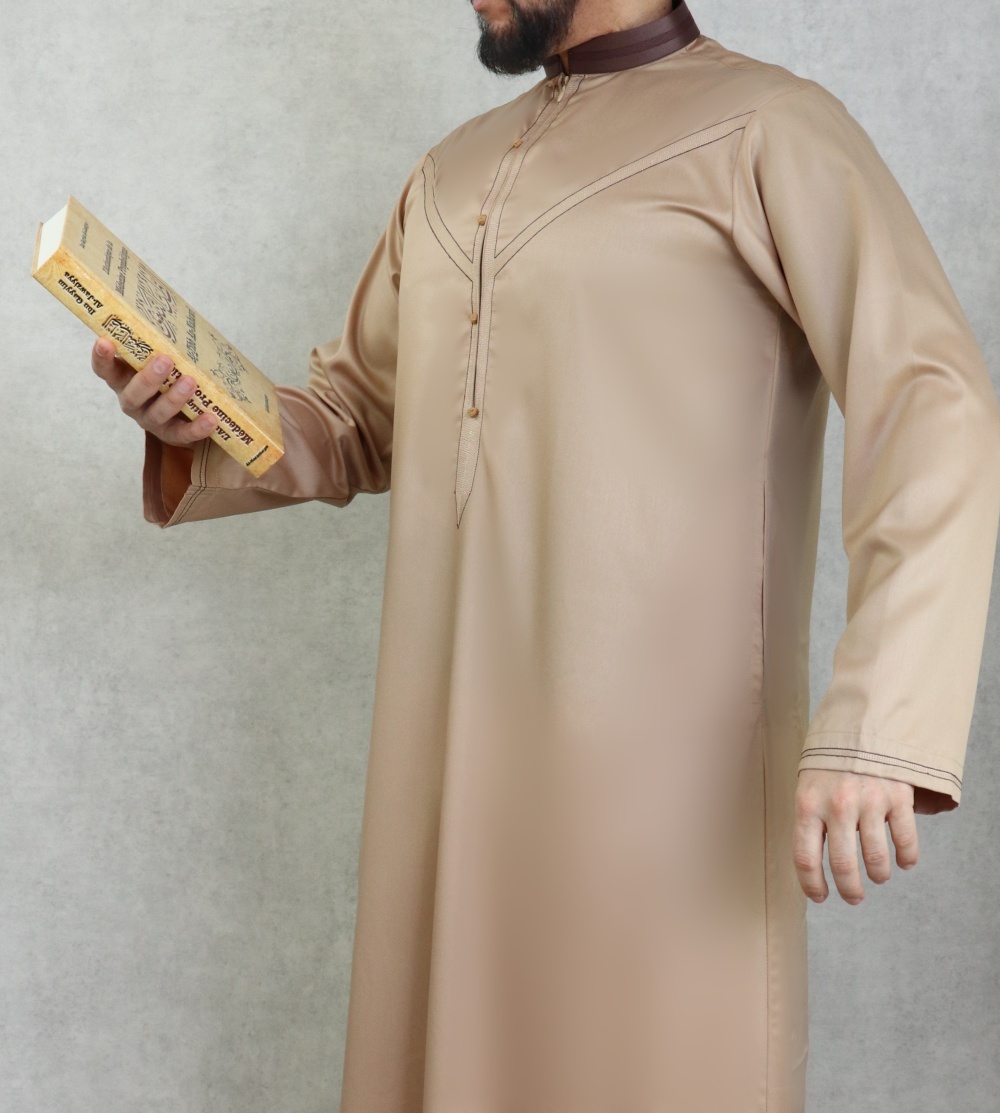 Qamis long, manches longues, ouverture zip cachée au niveau de la poitrine au niveau des faux boutons brodés.