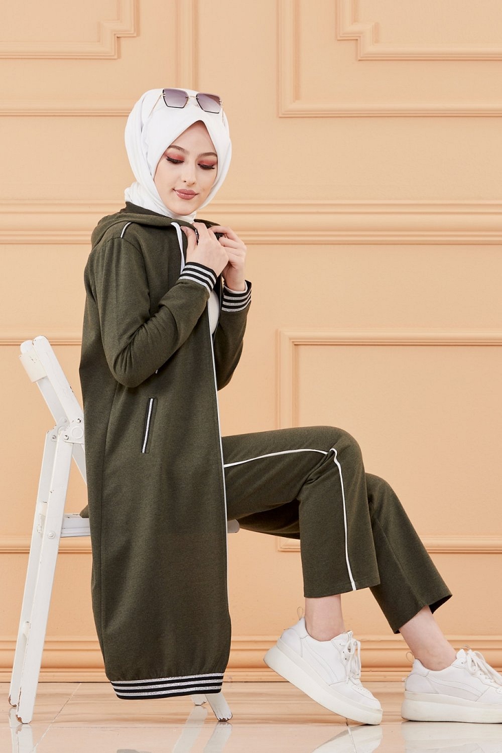 Bandes décoratives noires argentés... Veste longue zippée avec capuche.